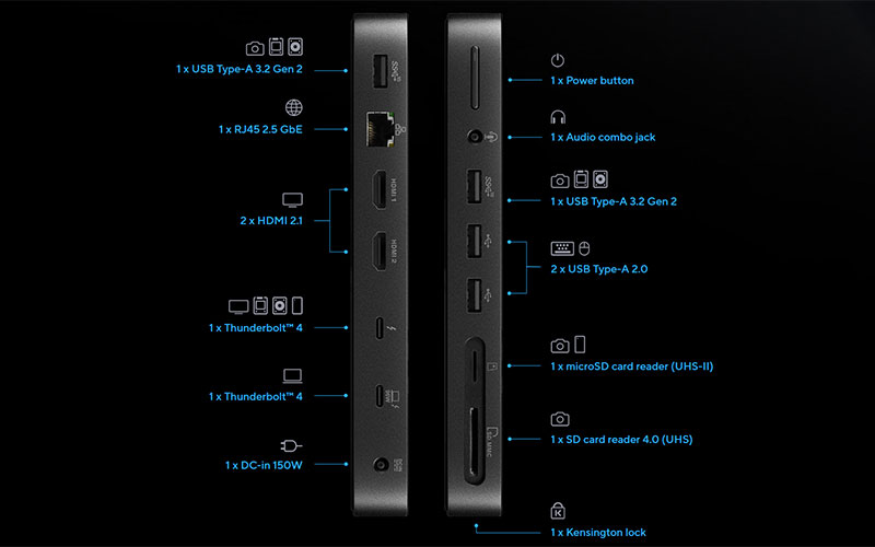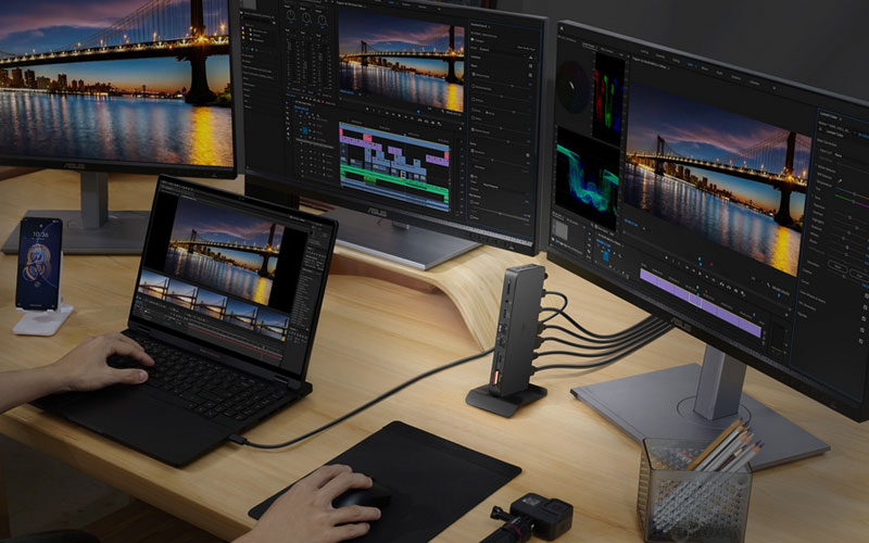 Un des principaux atouts de l’ASUS Triple Display 4K Thunderbolt 4 Dock est sa connectivité extensible. En plus des connecteurs vidéo, ce dock est équipé de nombreux ports USB qui permettent de connecter divers périphériques et même de recharger vos appareils mobiles. Il dispose de deux ports USB 3.1, deux ports USB 2.0, un port réseau RJ45 pour des connexions Internet filaires stables, ainsi qu’une prise audio pour les écouteurs. De plus, le dock inclut un lecteur de carte SD/Micro SD, facilitant ainsi les transferts de données lorsque vous travaillez avec des appareils photo numériques ou d’autres dispositifs de stockage. Grâce à cette connectivité complète, vous pouvez transformer n’importe quel espace de travail en un bureau performant et intégré, adapté à toutes vos exigences professionnelles.